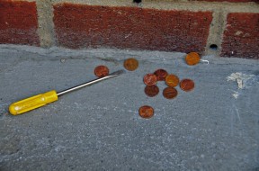 She gave me her penny and I handed her a small screwdriver. She stooped down and used the screwdriver to dig up a small metal bar.