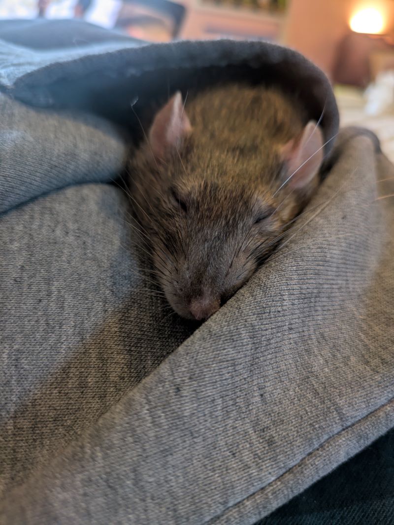 Eventually, she did start to show signs of decreased quality of life, at which point our vet and I agreed it was the right time for humane euthanasia. With heavy hearts, we said goodbye to her on January 14, 2025. I like to think that she has found Fig and my other rats in rattie heaven and spends her time cuddling and doing her favorite things with the biggest rat family.