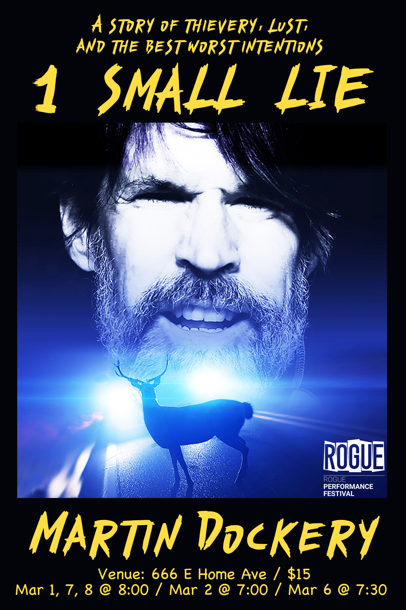 After more than fifteen years of touring stories to theaters and festivals across North America and beyond, I’m debuting a brand new story at this year’s Rogue Festival. 1 Small Lie is an escapist, nail-biting thriller about a family man who stumbles onto a crime in progress, and who then impulsively steals from the thieves. With no plan or forethought, he’s forced to improvise his way through an ever-mounting series of lies that threaten to destroy both his family and his very life. Told in an autobiographical style, this is a story of greed, deception, infidelity, and the dark underbelly of an otherwise “good” person’s soul.