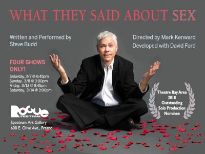 I’ve done a lot of theater over the years, first in Boston, and since 2006 in the Bay Area. I performed my first full-length solo show in 2016 and feel like I’ve finally found my niche in the theater world. I’ve performed “What They Said About Love” in L.A., Portland, Ottawa, Indianapolis, New York, Boston, and London. I’m looking forward to enjoying similar success with What They Said About Sex. It’s a pleasure to be debuting the first forty-five minutes of the show (which will ultimately be 60-75 minutes long) at the Rogue Festival. I’ve heard great things about the Rogue from other performers and am excited to take part in the 2020 festival.