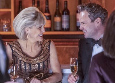 She’s back with her blond bob, fashionista style, four inch heels, and more murders in which to entice, entangle, and endanger her friends. With Covid restrictions closely followed, the group is back. After a brilliant Kissing Christmas Goodbye premiere in December, 2021, reviewed HERE, with three new AcornTV Originals: Love, Lies, & Liquor, A Spoonful of Poison, and There Goes the Bride. Each story is entertaining, clever, a bit quirky, and an endearing nod to the creator, author M.C. Beaton, who passed away in December, 2019, and to whom the movies are dedicated. The television series is adapted from Beaton’s iconic Agatha Raisin Mysteries, but there are enough additions, changes, and twists with Beaton’s original vision, I highly recommend that fans read the books, too.