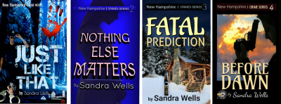 My name is Sandra Wells, and I write murder mystery books all set in the state of New Hampshire. I didn’t decide to become a writer until last March when I turned fifty-nine years old. I now have four books, The New Hampshire Series. They were written in eight months, all now published. I wrote them all on my Samsung Galaxy smartphone 9+, 929 miles away in Saint Clair, Tennessee. “Murder, mayhem and crooks gone wild” is the theme, and each book have two separate stories going on. I just start writing, and three-quarters of the way through a book, “I still don’t know what the ending is going to be.” Finding “cool ways” to kill off characters is part of my craft.