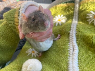 Whether you believe in fate, luck, or divine intervention––something or someone was looking out for these sweet babies, and they found a second chance at life with our Good Samaritan. Fortunately, her own babies were just about ready to be weaned and surrendered to Rattie Ratz, and the mother rat adopted the abandoned litter as her own. Once the abandoned litter of babies was old enough to be weaned, they too were surrendered to Rattie Ratz. Today’s story features two of the baby girls who were abandoned in the apartment with their siblings. These girls may have had an inauspicious beginning, but they are now living a beautiful life and are being spoiled by a family that loves and appreciates them dearly. Not long after the babies came to the rescue, Selena Polston and her daughter Noa Schwartz reached out to Rattie Ratz in the hope of finding a companion or two for their girl Plum, who had recently lost her sister Pablo. Selena and Noa followed the information Rattie Ratz provided on how to do rat introductions, and before long Plum found herself with two new friends. “We wanted Plum to have sisters. Fig and Squirrel ended up being more like her children as she became a very protective ‘auntie,’ laying her body on them to keep them warm, grooming them, and generally watching over them. Super cute!” Squirrel (a hooded agouti––brown head with white body) and Fig (a Berkshire agouti––brown with a white belly) gained a rat auntie and two human moms. The girls are very sweet and enjoy spending time riding around in their doggy carrier. They are now middle aged, and Fig in particular has become a bit more rotund, requiring her to more carefully squeeze past her sister, Squirrel, in their preferred sputnik hide, even though it’s an extra-large. No judgment here! They will do anything for a pumpkin seed, which may or may not explain Fig’s expanding midsection, but who can deny giving her such a simple but heartfelt pleasure? I assure you I would not be strong enough to stand between a rattie and her beloved pumpkin seeds. Selena explains how “their real mom is my daughter Noa, who is away studying in France, so Squirrel and Fig are on Zoom with her often.” While Selena spends time with her grand-rats, she describes how “they are both total chaos potatoes and have eaten holes in whatever they can. Still, I can’t help but love them; they have the most adorable little faces and will brux loudly when you pet their little heads.”The cherry on top of this heartwarming story is hearing how Squirrel and Fig have brought their human companions closer together. Selena and Noa both agree that sharing the experience of owning rats has provided an opportunity for them to bond with each other as well. Selena shares how, “no matter how we felt about each other, we could always spend countless hours talking about ‘our babies,’ taking on their perspective and personalities.”