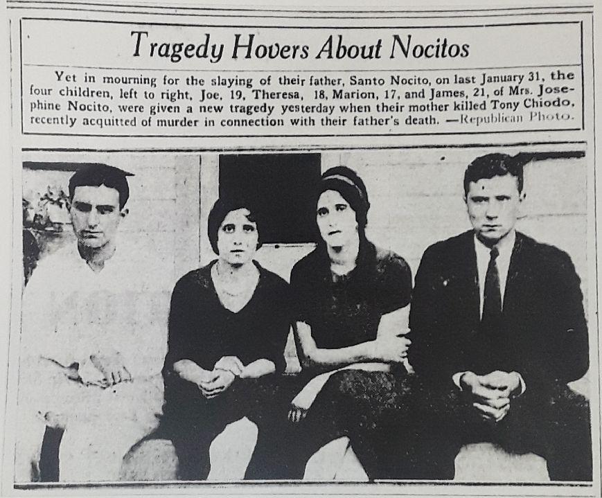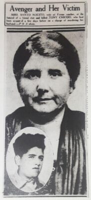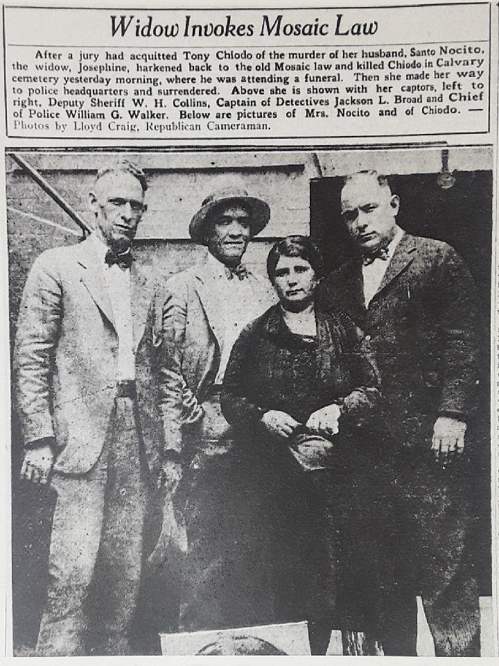 “Mrs. Josephine Nocito, aged 40, mother of four children and wife of Santo Nocito—who was slain … in a duel last January—shot and killed Tony Chiodo, her husband’s slayer… Both were attending the funeral of Joe Gambero, 42 … a mutual friend. The casket had just been lowered into the grave when the black-clad, comely widow walked up to the slayer of her husband and opened fire.
