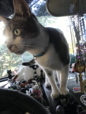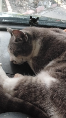 He loves to ride in the car lying on the dash. He sees me get into my car, and he runs and jumps through the window. Curls up on the dash. Looks at me like “ok, ready to go.” When I pull into the driveway, he will come out for a ride up to the house.