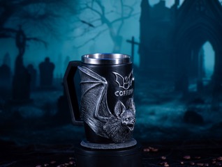 Kat: In addition to coffee, we offer mugs (including our famous Bela Mugosi), coffin-shaped Bat Mats and coffee trays, slate coasters, bumper stickers, and t-shirts. If you catch us in person, you’ll also find fun items like plush bats, coffee spoons, bat hats, bat jewelry, and other spooky surprises – all part of our mission to spread bat awareness.
