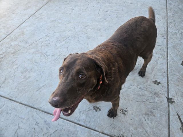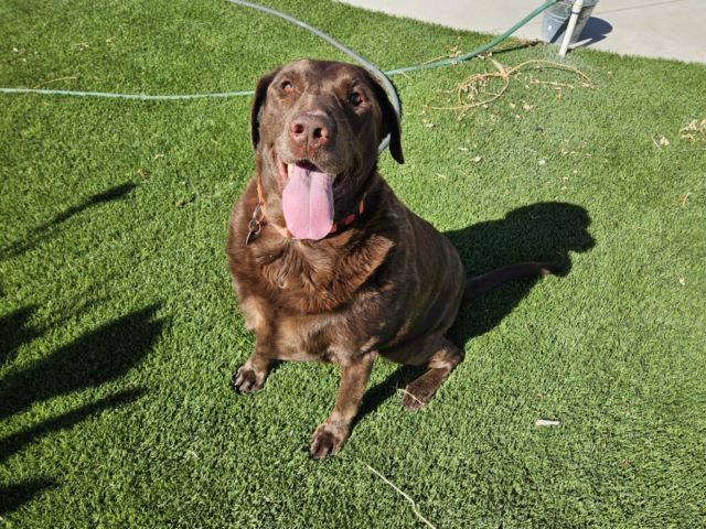 Sadie is a gorgeous 8-year-old Chocolate lady, and a beautiful example of a senior dog with so much love and companionship to give! She loves leisurely walks, swimming, and riding in the car listening to music with the windows down. She is laidback, fun-loving, and simply a joy to be around. Her leash manners are lovely, and she is happy just to be by your side! After her person was moved into a retirement home, other family members took her in, but left her in a small yard with little attention or exercise and a lot of food. Subsequently, our dear Sadie weighed in at an unhealthy 101 pounds when she came into LRRF. Now she is settled into her foster home and is getting regular exercise and healthy meals and she is down to 95 pounds. Sadie is looking for a forever family who can help her maintain her healthy diet and exercise regimen, and of course give her lots of love and cuddles. If you have a soft spot on your couch and a heart looking for a very special love, apply to make Sadie a member of your family at labrescuefresno.org!