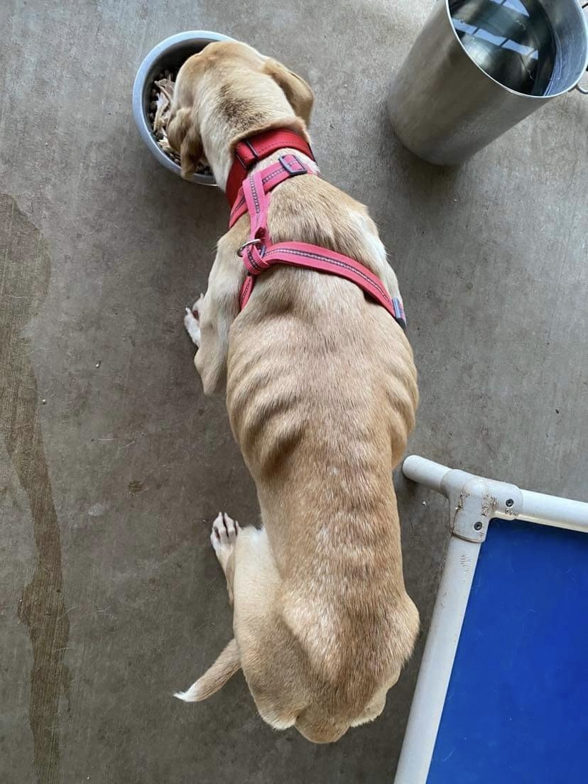Finally, a kind person spotted her and left some food out for her, and she stayed in that area of Tollhouse. Lab Rescue was contacted, and a trap was set. It didn’t take long for her to be caught due to the yummy food in the trap. Cookie was finally safe on February 28, 2023.It is a long, slow process for an emaciated dog like Cookie to get back to a healthy weight. It was also a long process before she would trust humans. Her foster worked with her daily to gain her trust. She had obviously never been in a home, nor treated with kindness or affection.